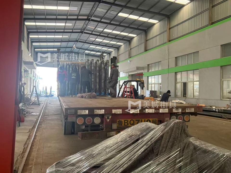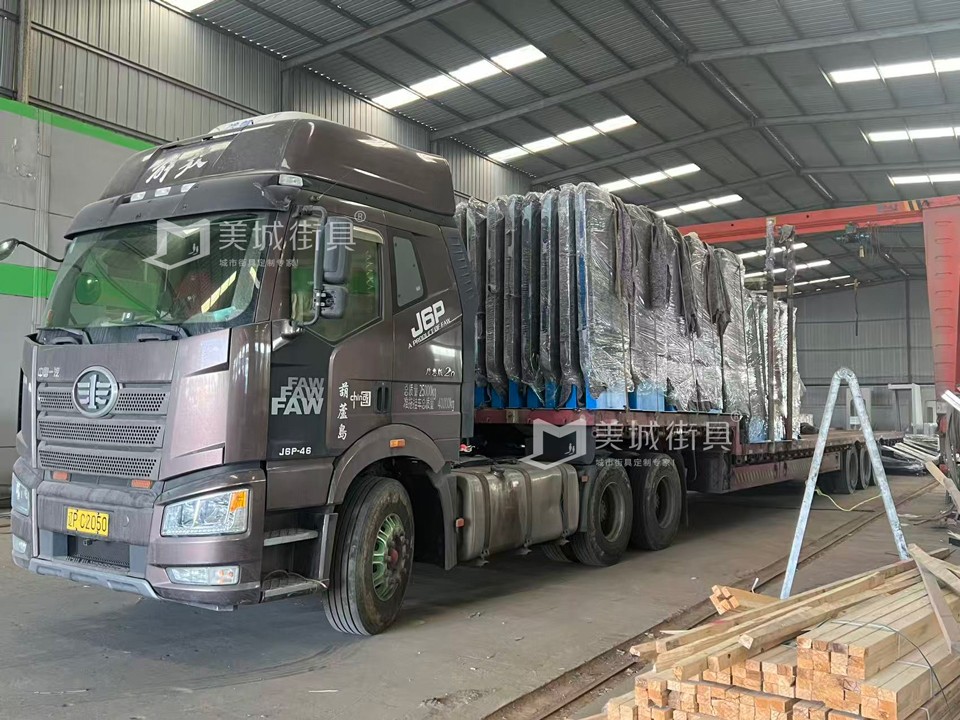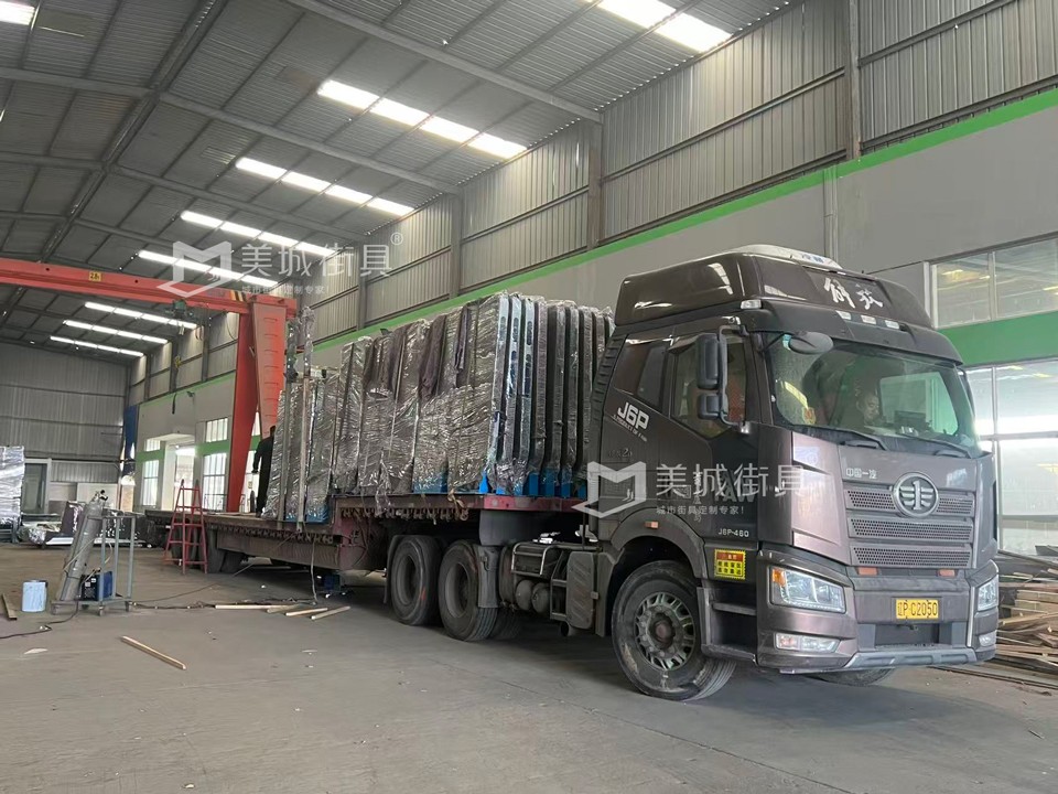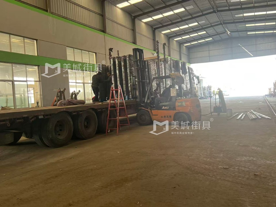 江苏美城街具供应葫芦岛第四批公交候车亭发货案例,以下是候车亭站台发货现场图: